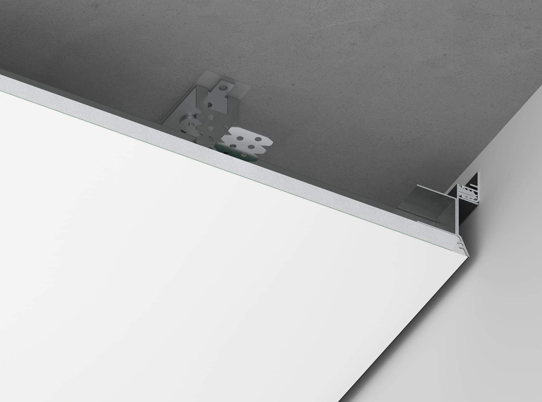 פרופיל צל גבוה > מייצר ניתוק של צל ב- 45 מעלות. מעוצב ומרשים ללא ניראות גב הפרופיל. יושב בתוך פרופיל דמפר למניעת סדקים בתזוזת התקרה.
