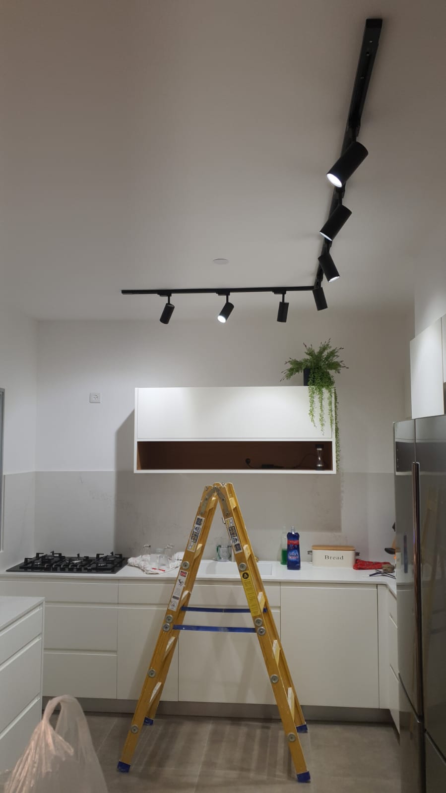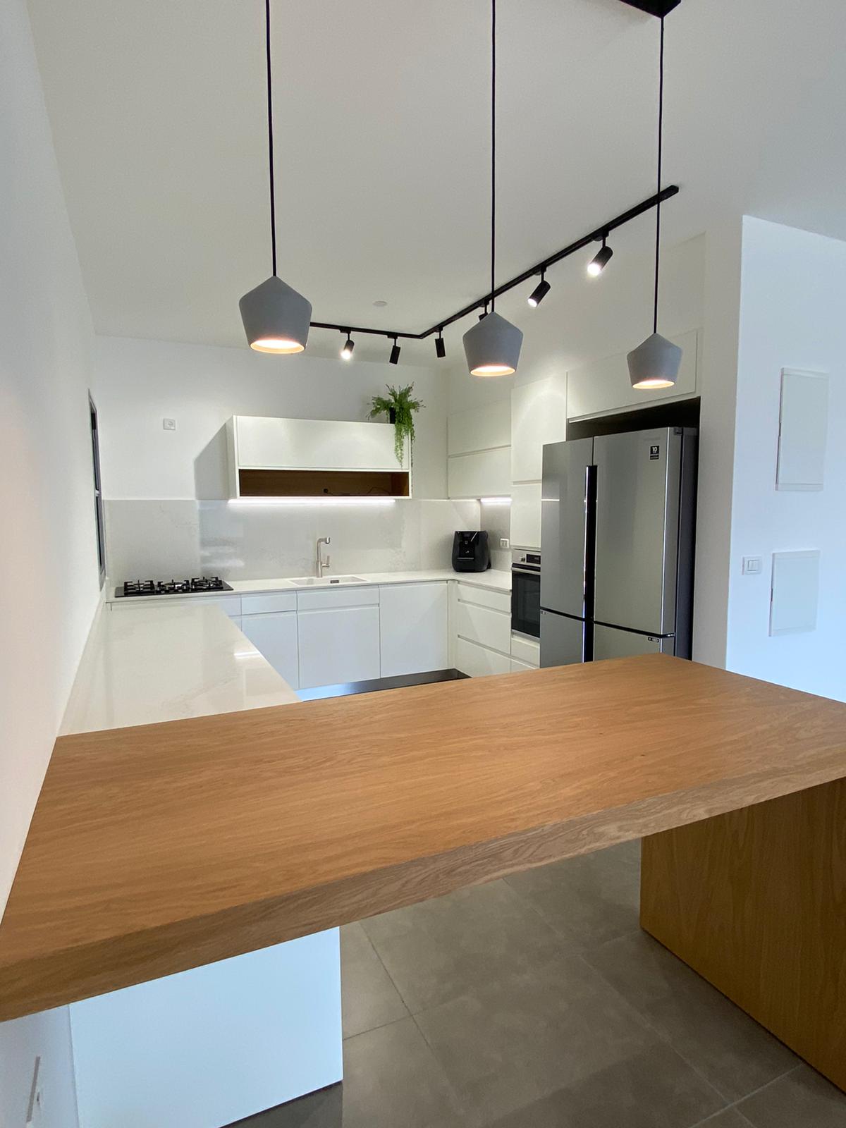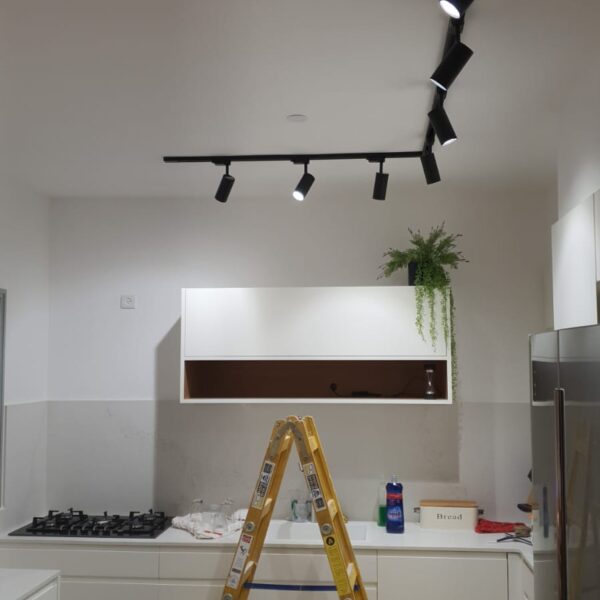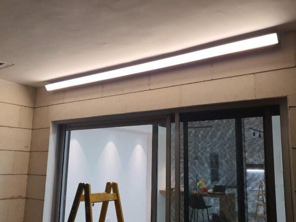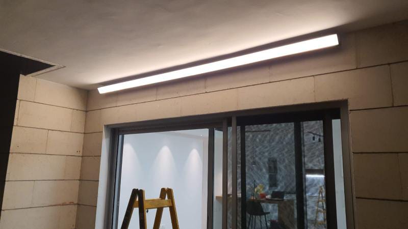 עיצוב תאורה בהתאמה אישית למטבח ספוטים לפסי צבירה מתכוננים, מעל האי גופי תאורה ביציקה קלה של בטון. לתאורת חוץ פרופיל לד AR-8112 משופע ב45 מעלות באורך 3 מטר ועוד
