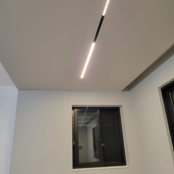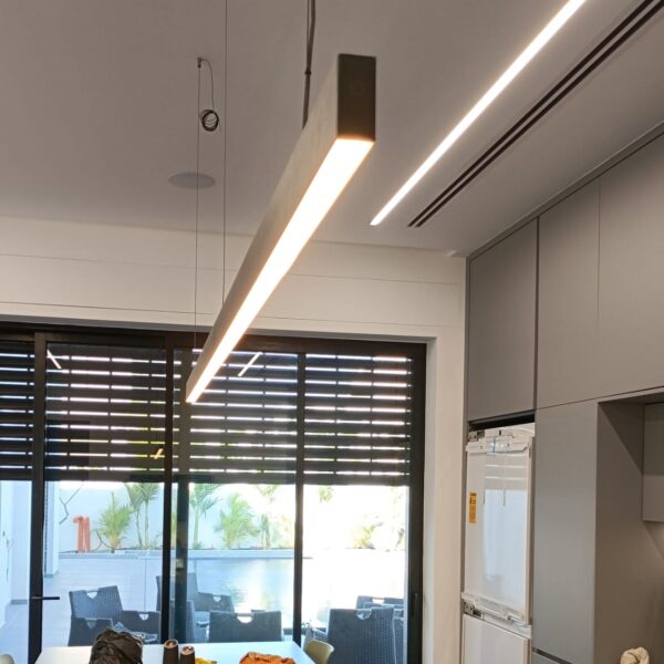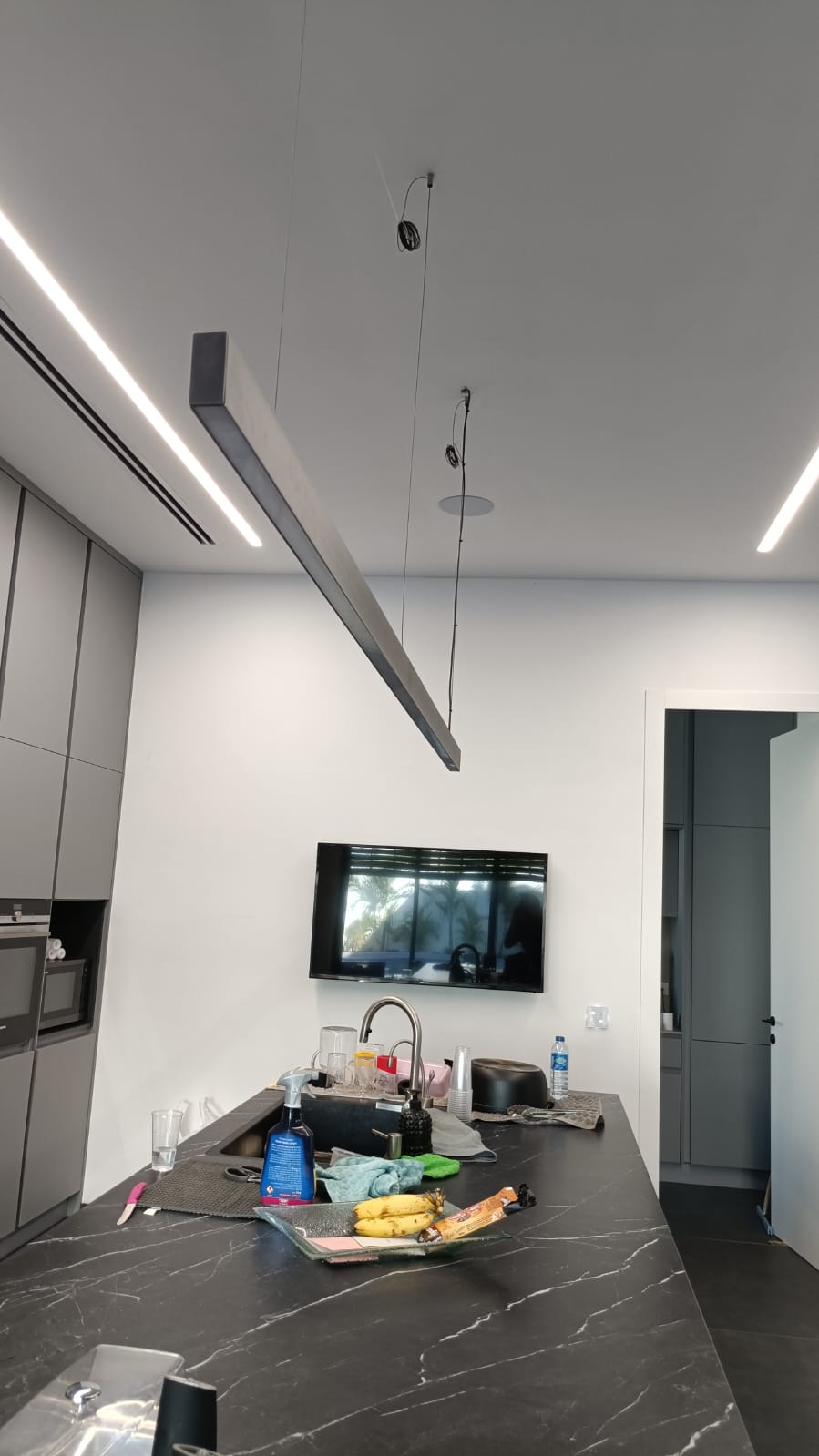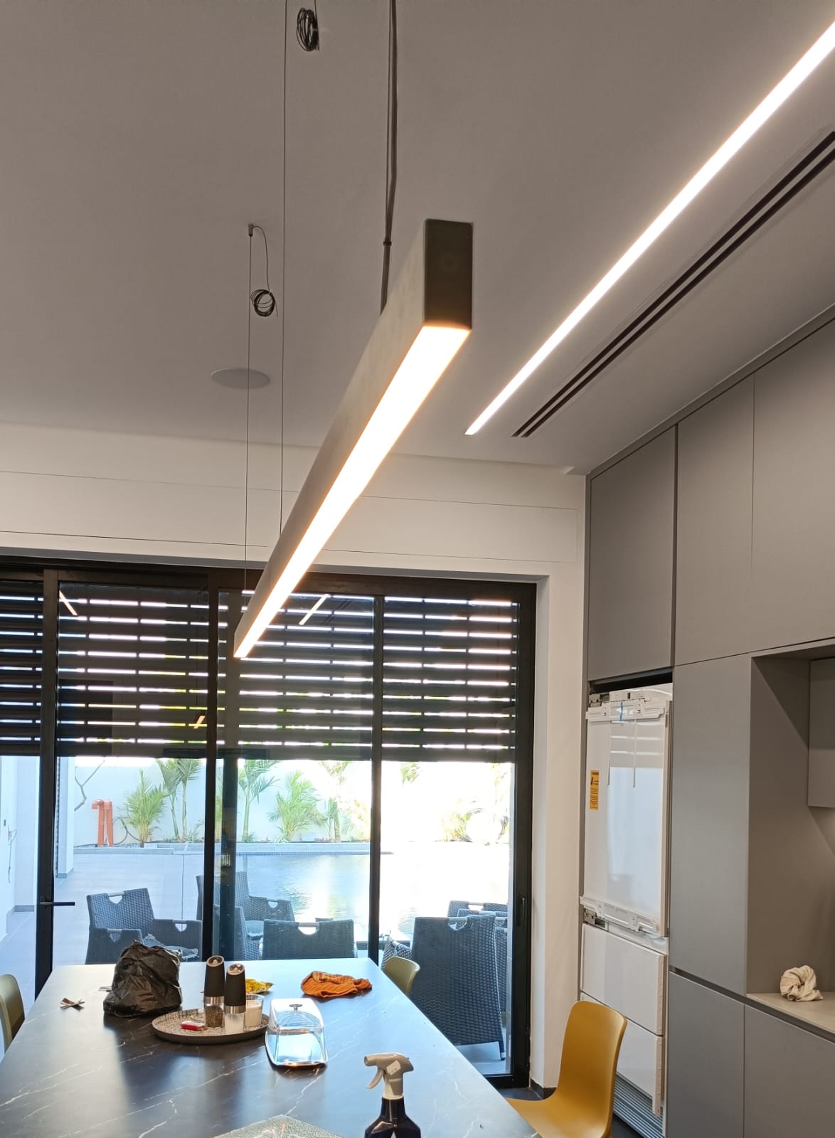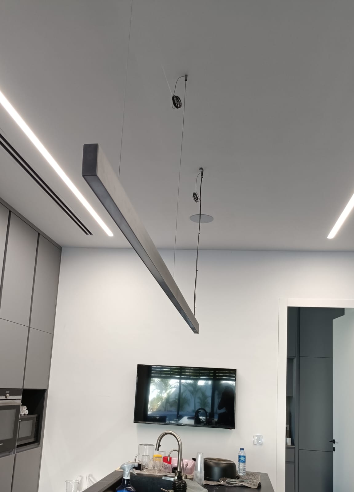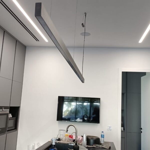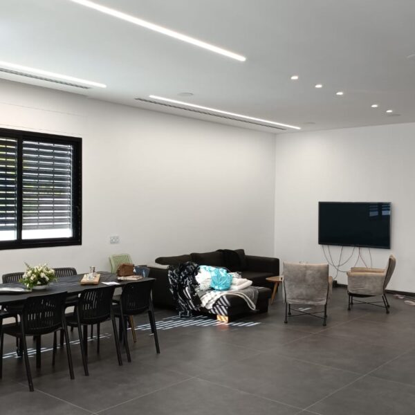 עיצוב תאורה יצור פרופילים לד AR-6114 TRIMLESS ופרופיל לד תלייה AR-3595. ספוטים שקועים בגבס, צילינדרים צמודים מוגני מים לתאורת חוץ, מאווררים מעוצבים ועוד