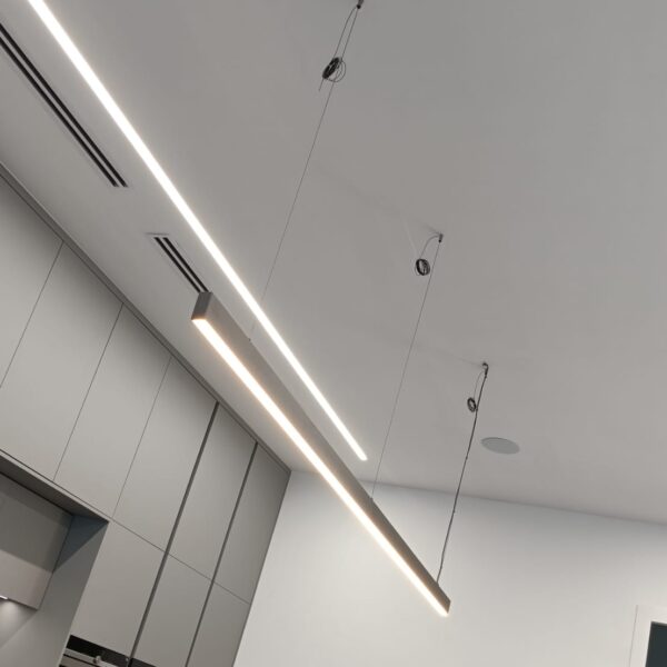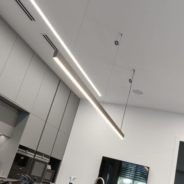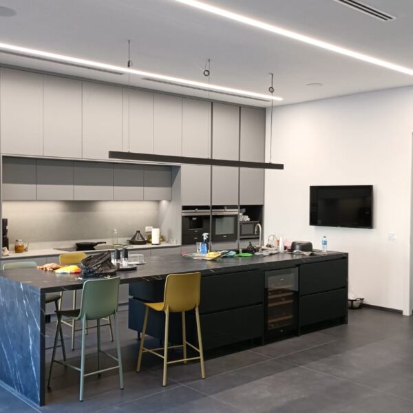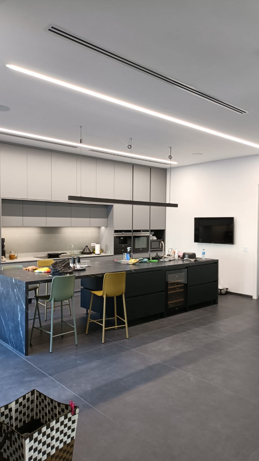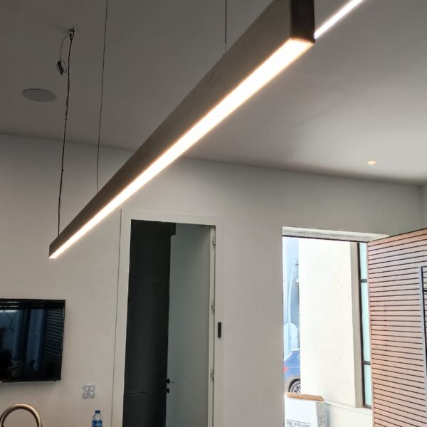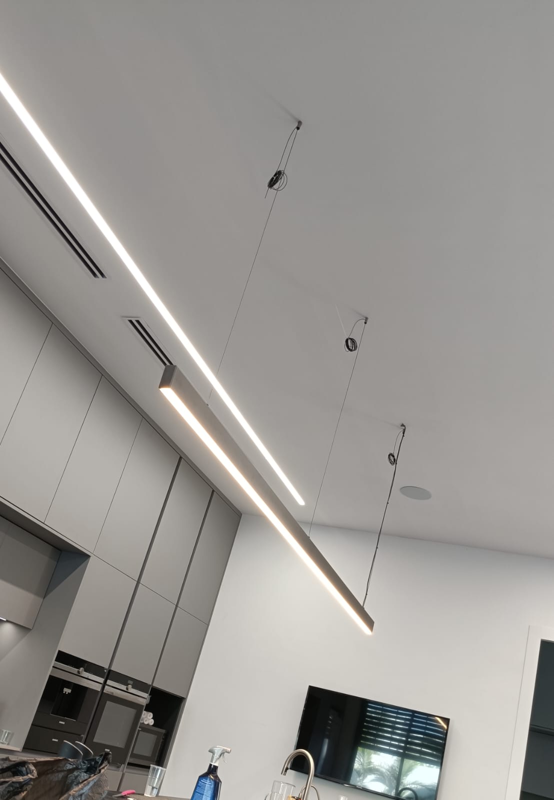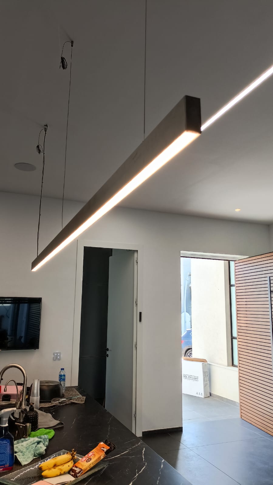 עיצוב תאורה יצור פרופילים לד AR-6114 TRIMLESS ופרופיל לד תלייה AR-3595. ספוטים שקועים בגבס, צילינדרים צמודים מוגני מים לתאורת חוץ, מאווררים מעוצבים ועוד