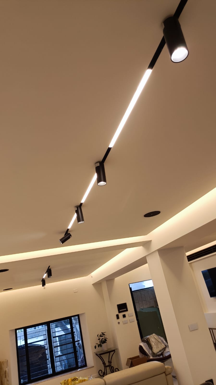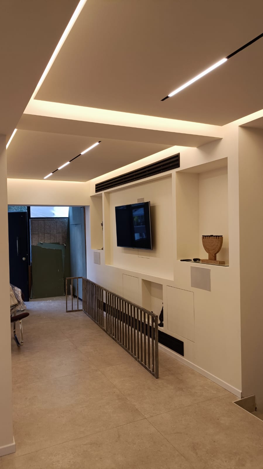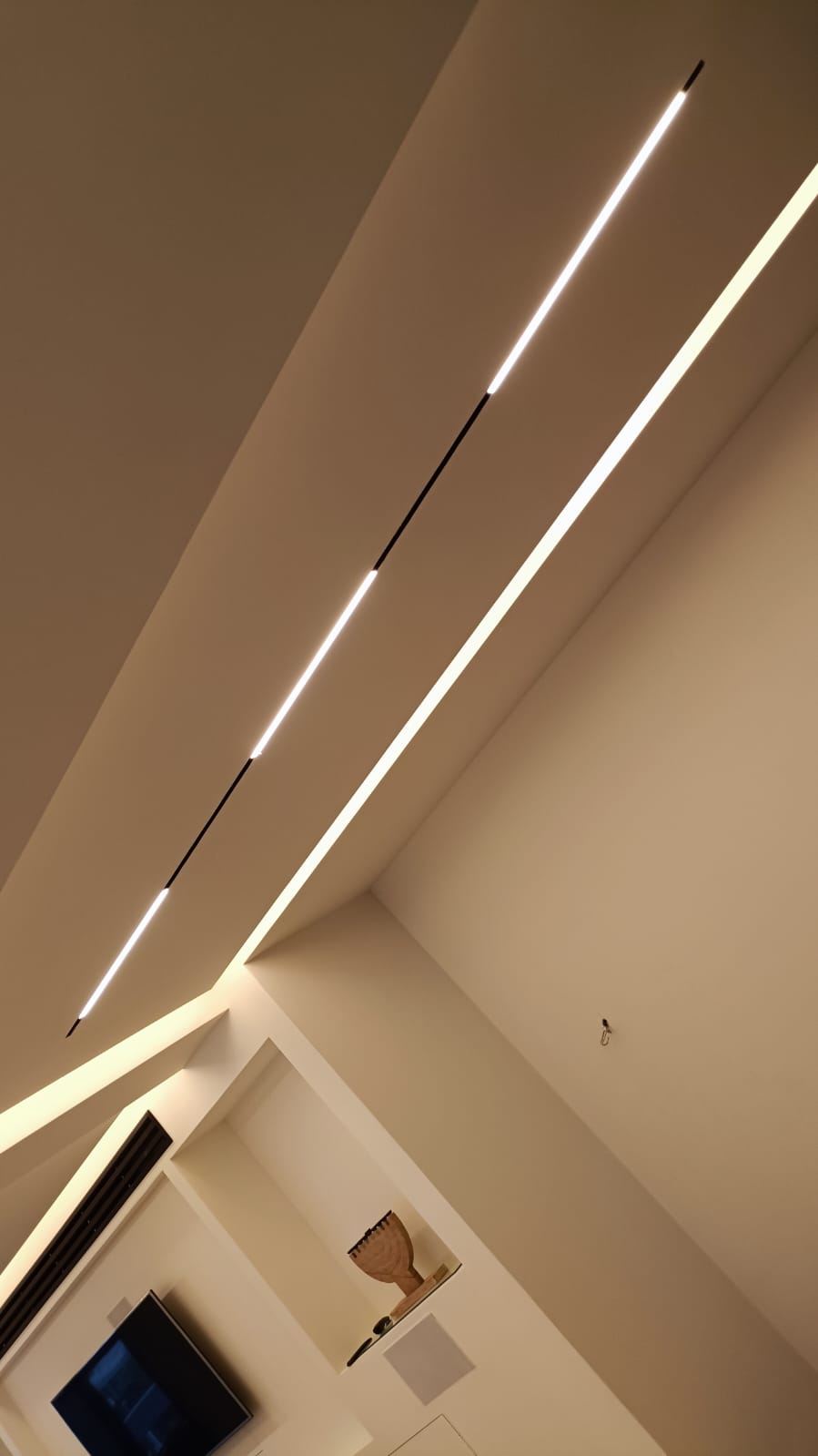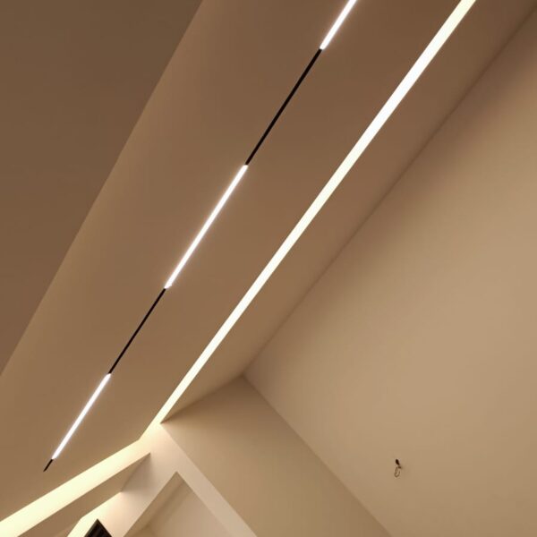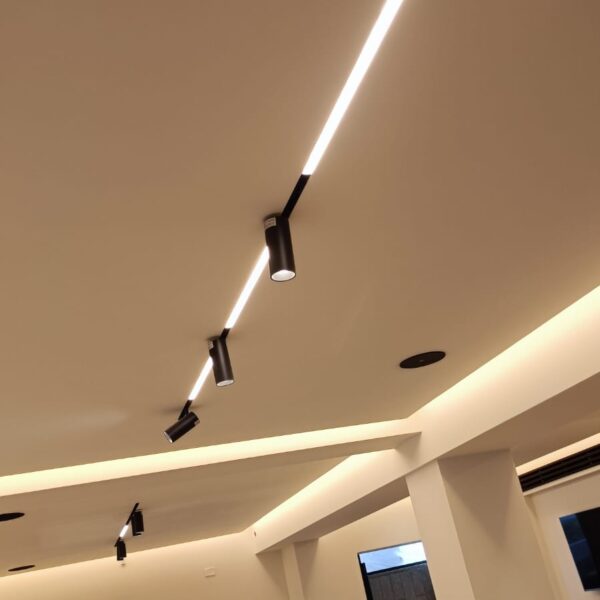 עיצוב תאורה, שילוב של תאורה נסתרת ופרופיל מגנטי שקוע בגבס בשילוב אלמנטים סמויים ומתכווננים