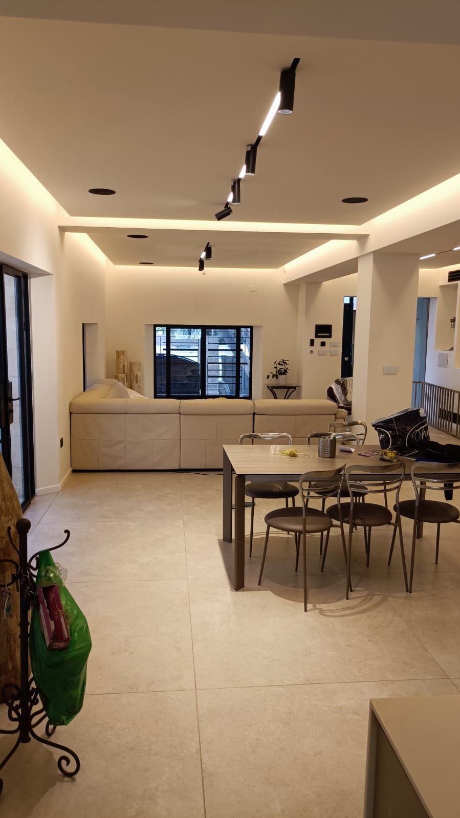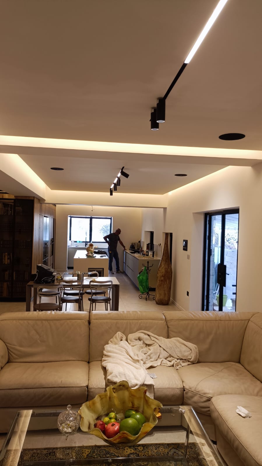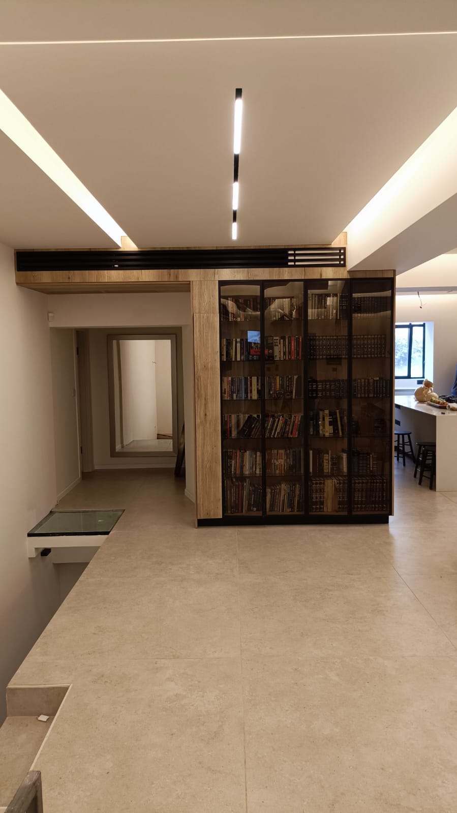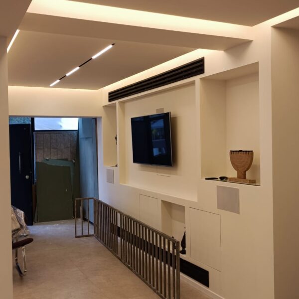 עיצוב תאורה, שילוב של תאורה נסתרת ופרופיל מגנטי שקוע בגבס בשילוב אלמנטים סמויים ומתכווננים
