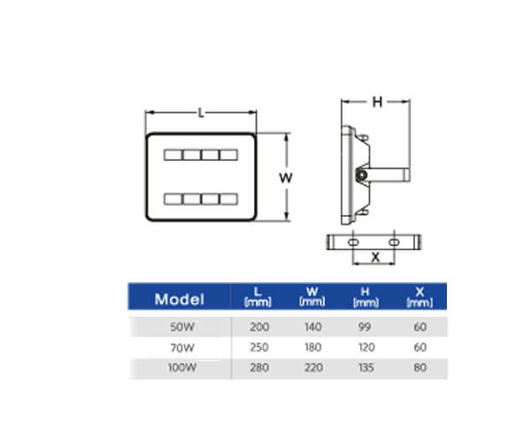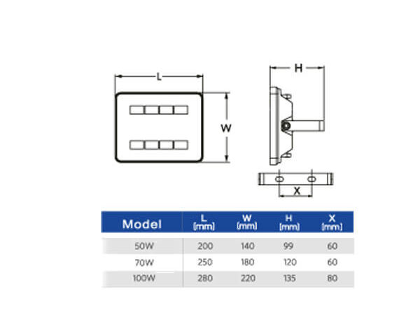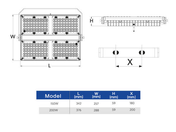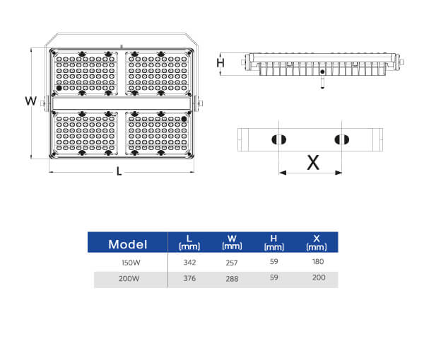 גוף תאורה איכותי הצפה זכוכית חלבית נגד סינוור מתאים לשימוש תאורת חוץ/פנים. מקור אור 50W-70W-100W-150W-200W LED OPPLE. מיוצר מאלומיניום. זמין בצבע אפור.