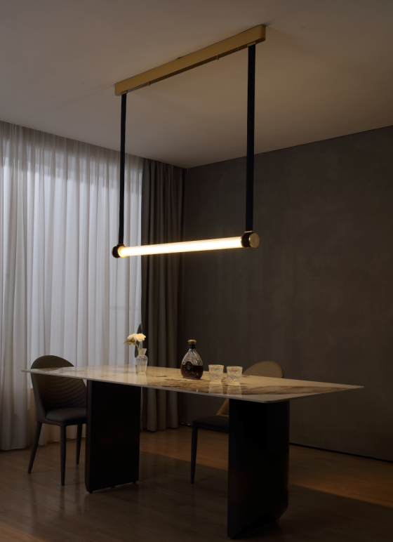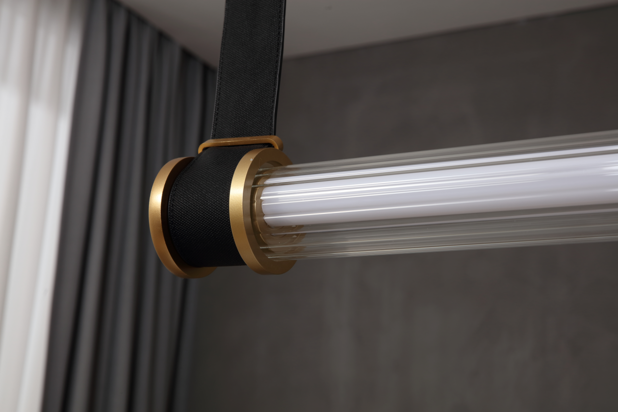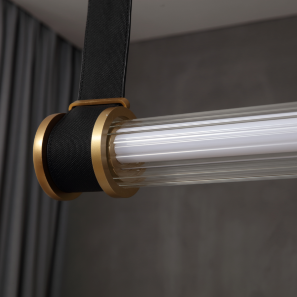גוף תאורה תלייה מעוצב מרשים במיוחד תלוי על חגורות מאיר ב360° לשימוש תאורת פנים. מקור אור 30W LED EPISTAR. מיוצר מאלומיניום ופוליקרבונט. זמין בצבע זהב מט.