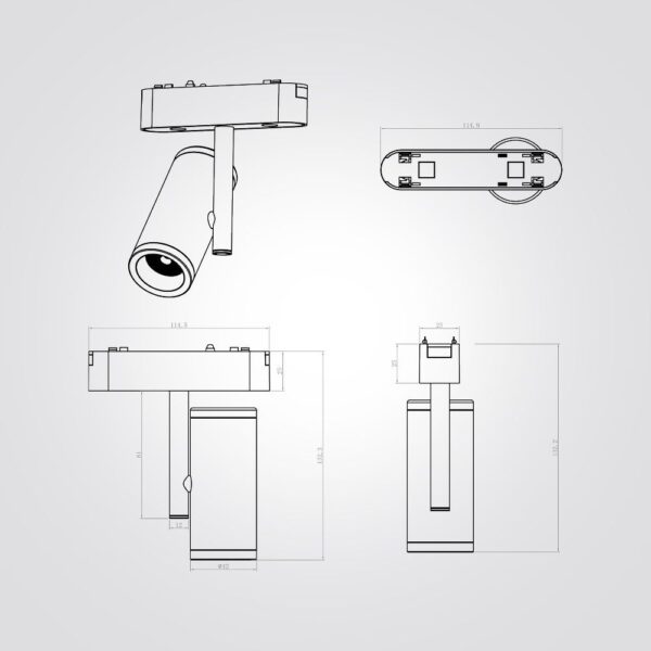 גוף תאורה ספוט מגנטי מעוצב מתכוונן לשימוש תאורת פנים. מקור אור 8W LED. מיוצר מאלומיניום. זמין בצבע שחור מט, לבן מט.
