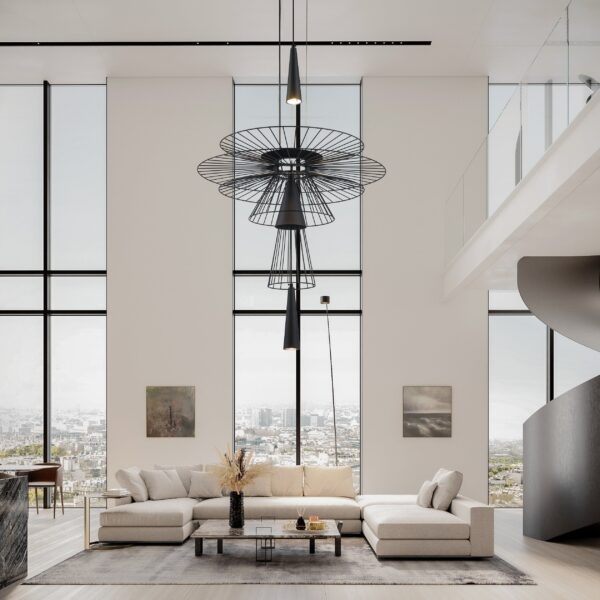 גוף תאורה תלייה מעוצב קלאסי עדין לשימוש תאורת פנים. מקור אורGU10 2X7W LED. מיוצר מאלומיניום. זמין בצבע שחור מט.