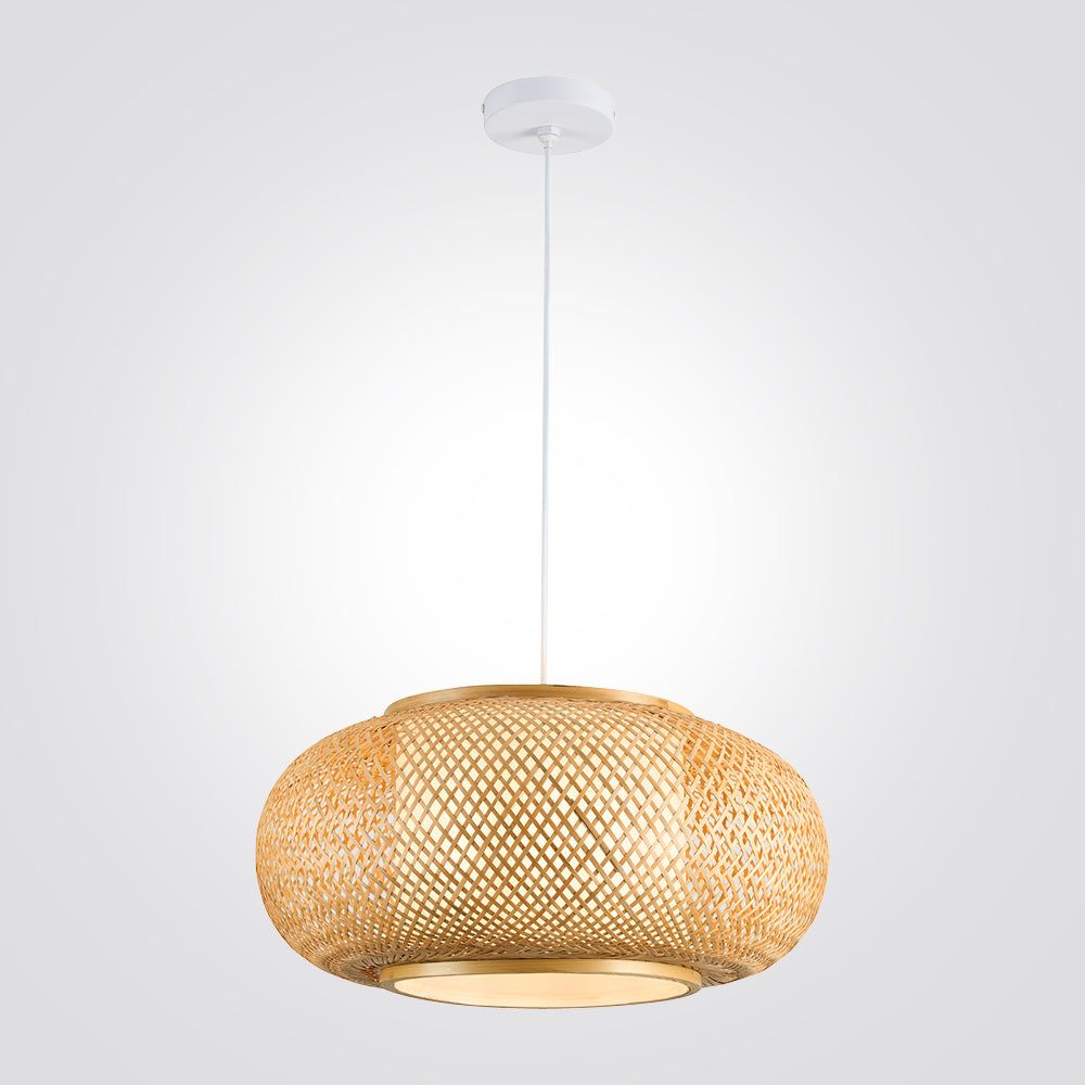 גוף תאורה תלייה מעוצב בעל אהיל עשוי קש טבעי – ראטן לשימוש תאורת פנים. מקור אור E-27. מיוצר מקש ומבד.
