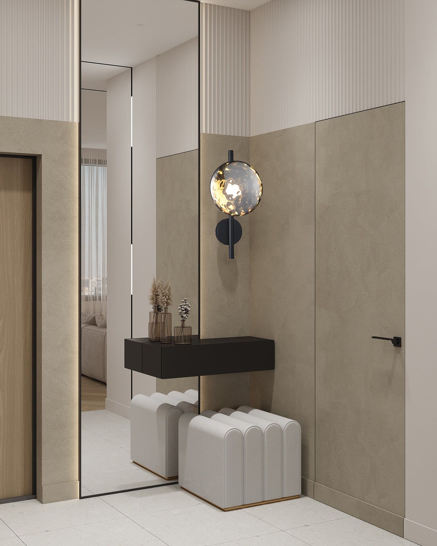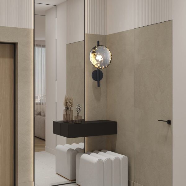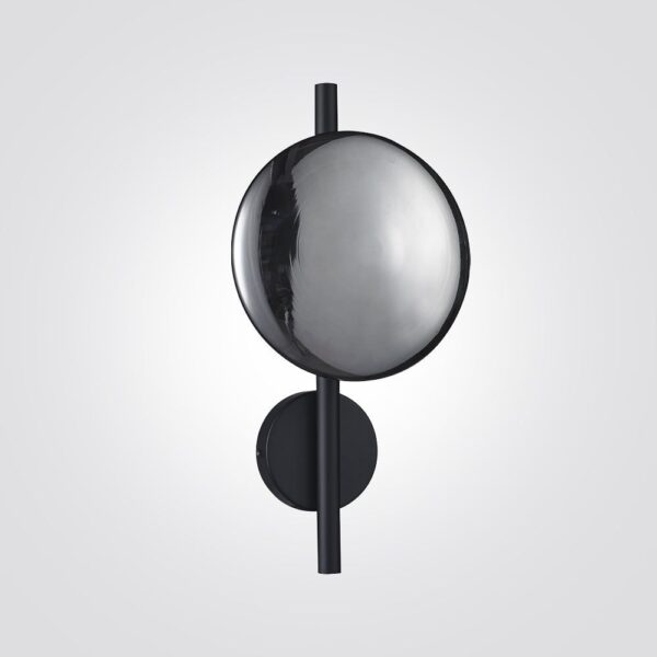 גוף תאורה צמוד קיר מעוצב עגול לשימוש תאורת פנים. מקור אור 5W LED. מיוצר ממתכת וזכוכית. זמין בצבע שחור מט וזכוכית מעושנת.