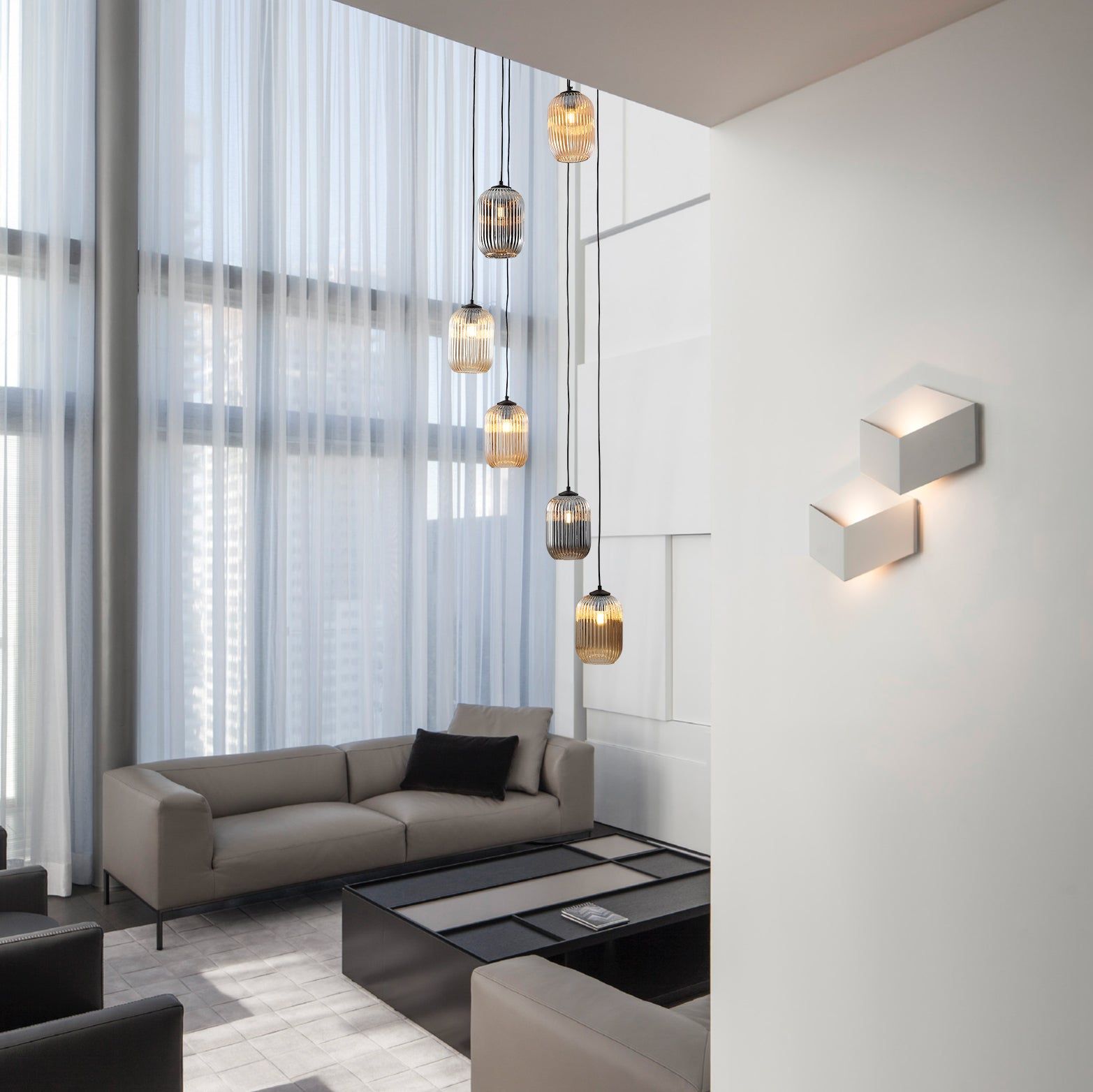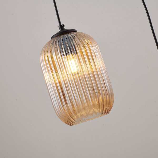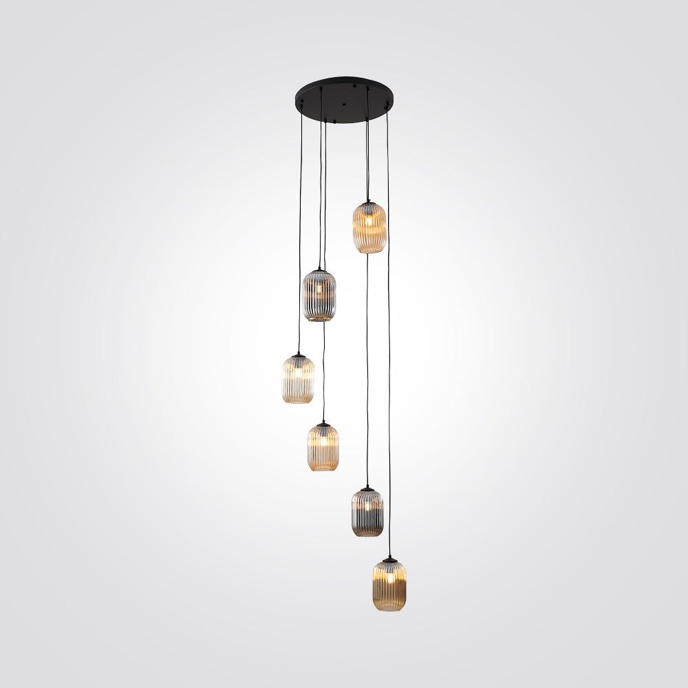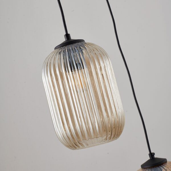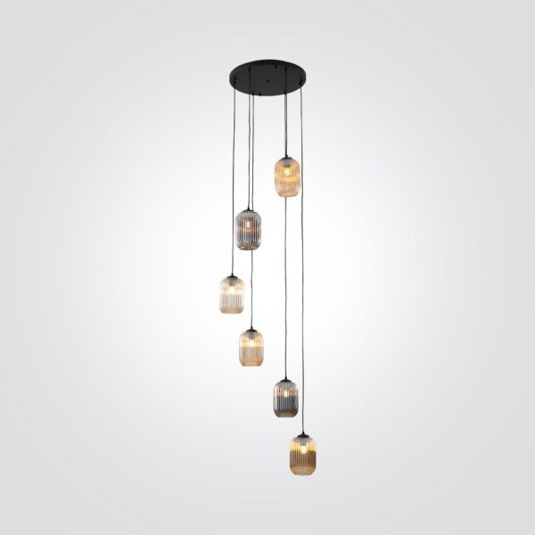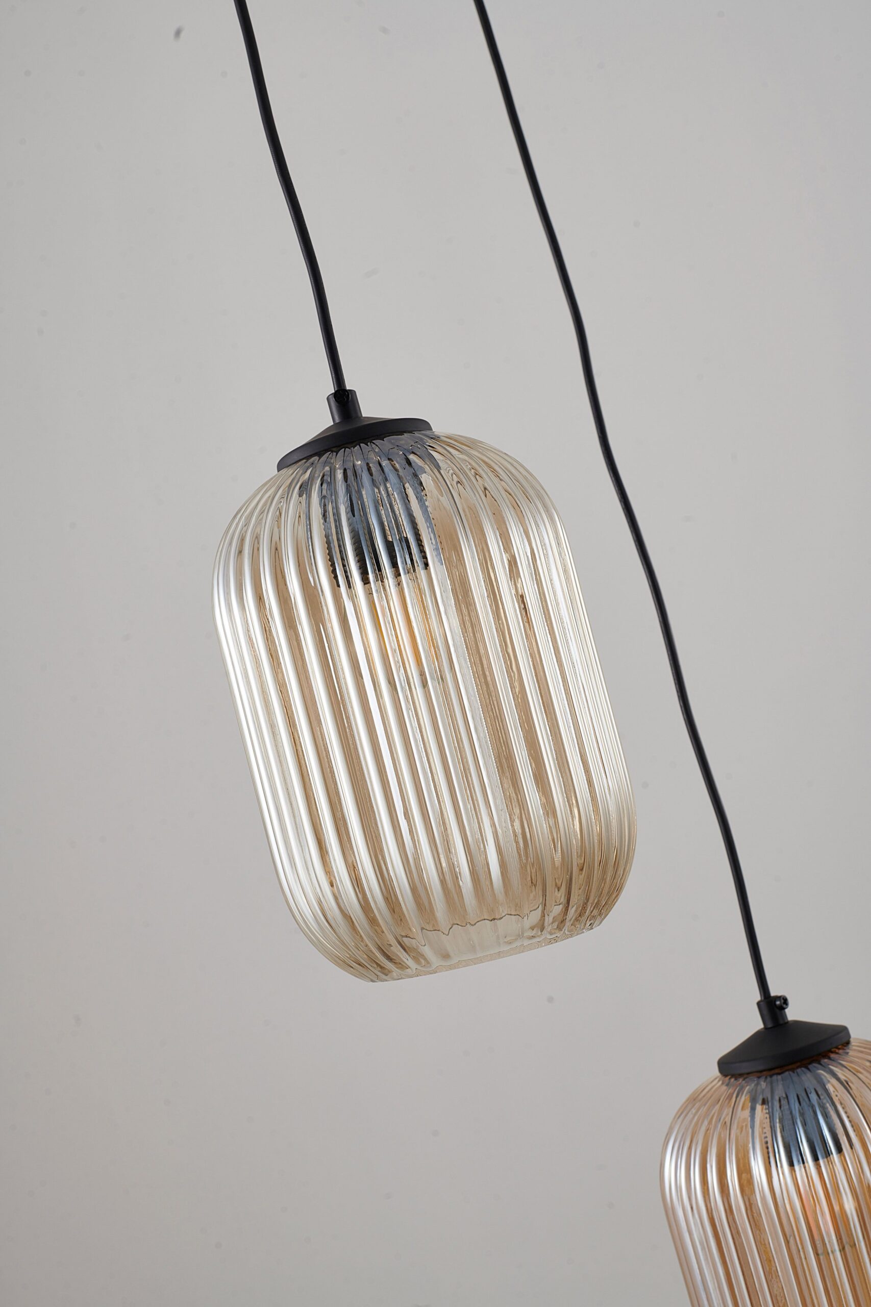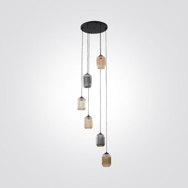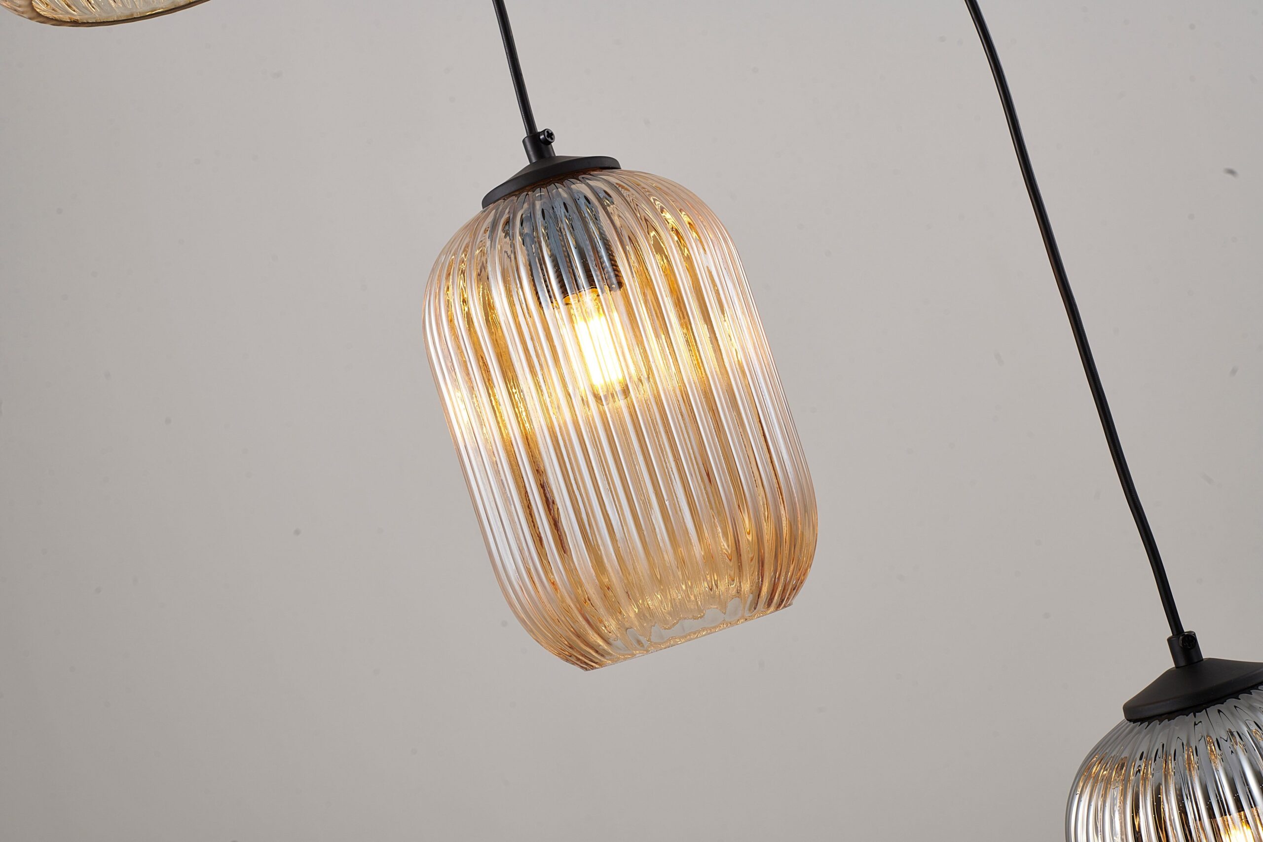 גוף תאורה תלייה מעוצב לשימוש תאורת פנים. מקור אור 6XE-27. מיוצר מאלומיניום וזכוכית. גימור שחור מט. זכוכית אמבר, מעושן, דבש.