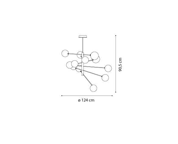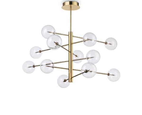 גוף תאורה תלייה מעוצב לשימוש תאורת פנים. מקור אור 12X2W G4. מיוצר מברזל וזכוכית. זמין בצבע זהב מט.