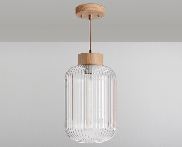 גוף תאורה תלייה מעוצב לשימוש תאורת פנים. מקור אור E-27. מיוצר מזכוכית ועץ. זמין בצבע עץ וזכוכית שקופה, עץ וזכוכית חלבית.