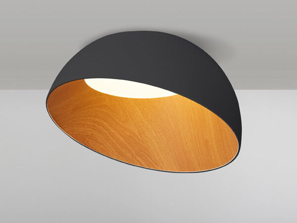 גוף תאורה צמוד תקרה מעוצב משופע לשימוש תאורת פנים. מקור אור 40W LED. מיוצר מאלומיניום. זמין בצבע שחור ועץ, לבן ועץ. ניתן לעמעום TRIAC