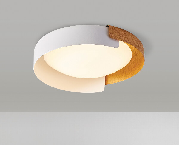גוף תאורה צמוד תקרה מעוצב עגול חצוי מרשים במיוחד לשימוש תאורת פנים. מקור אור 40W LED. מיוצר מאלומיניום+אקרילי. זמין בצבע שחור ועץ, לבן ועץ.