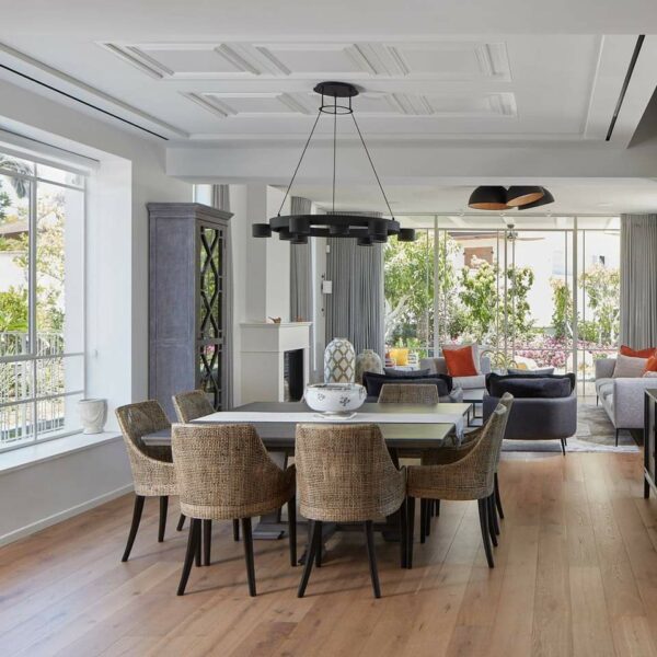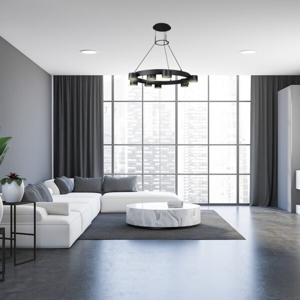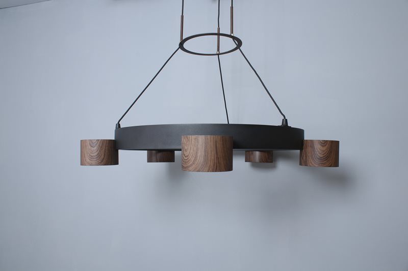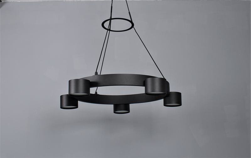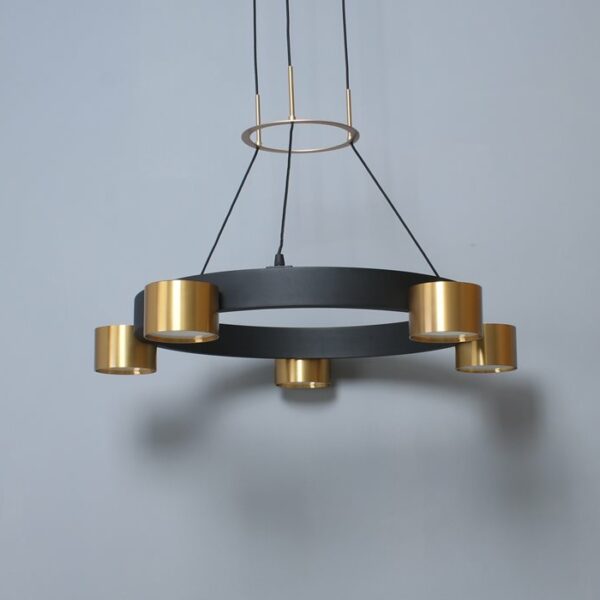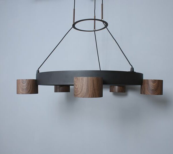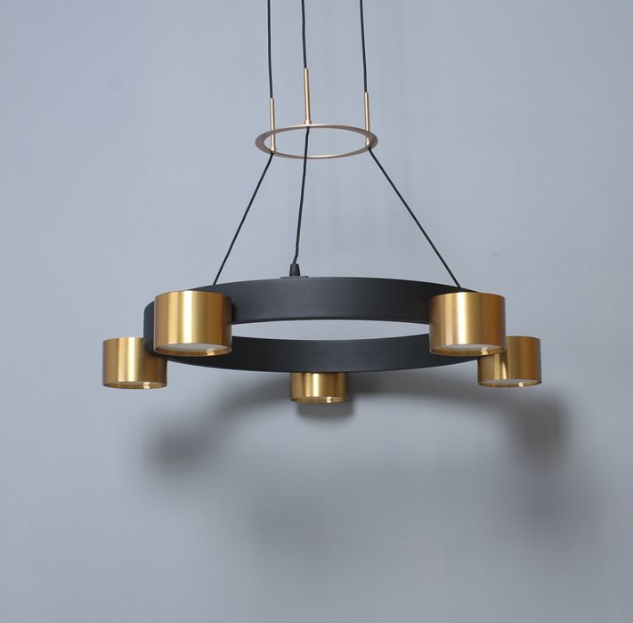 גוף תאורה תלייה מעוצב עגול בשילוב צילינדרים עדין לשימוש תאורת פנים. מקור אור 5X12W LED BRIDGELUX. מיוצר מאלומיניום. זמין בצבע שחור מט, שחור וזהב, שחור ועץ.