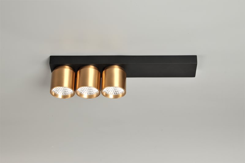 גוף תאורה צמוד תקרה מעוצב עם צילינדרים לשימוש תאורת פנים. מקור אור 3X8W LED. מיוצר מאלומיניום. זמין בצבע שחור מט, לבן מט, שחור וזהב מט, לבן וזהב מט, שחור ולבן מט.