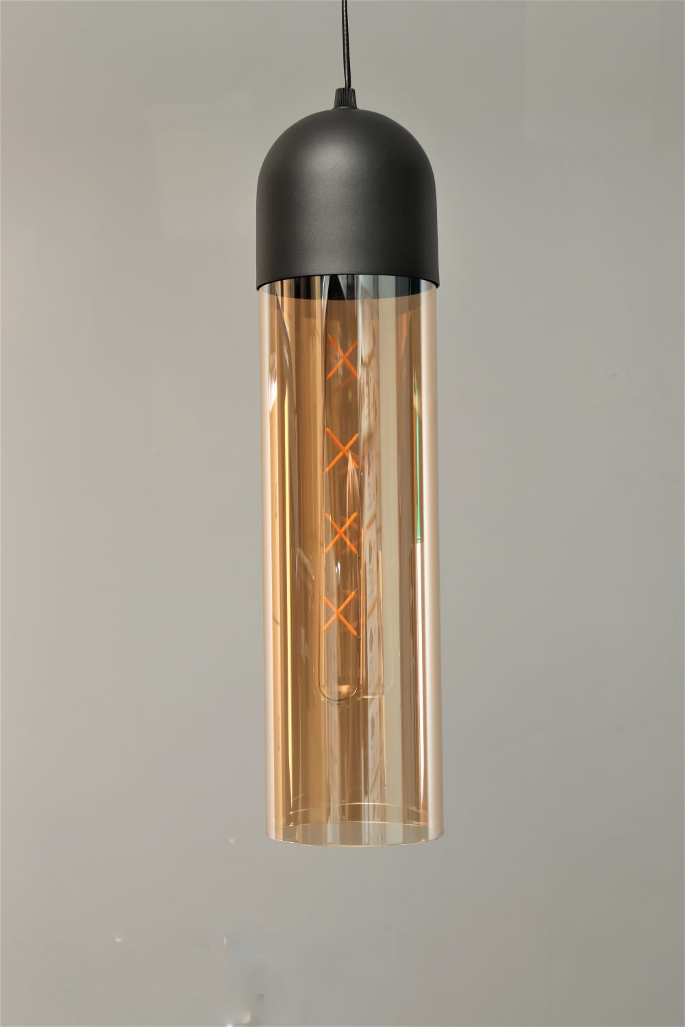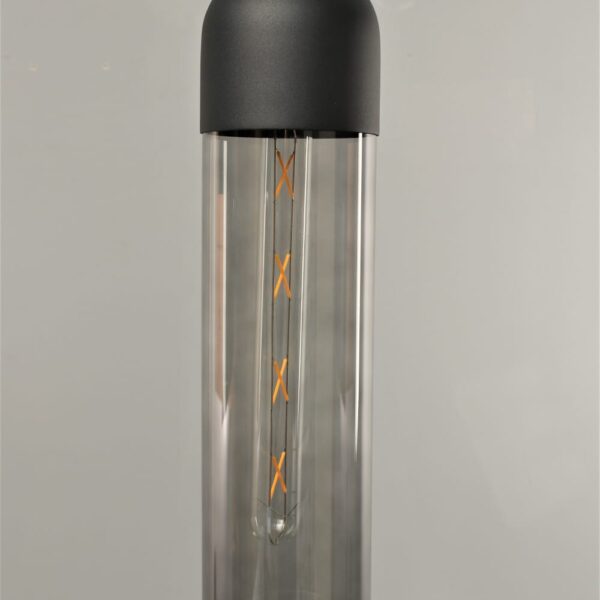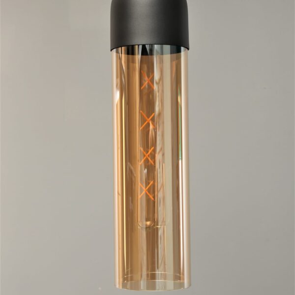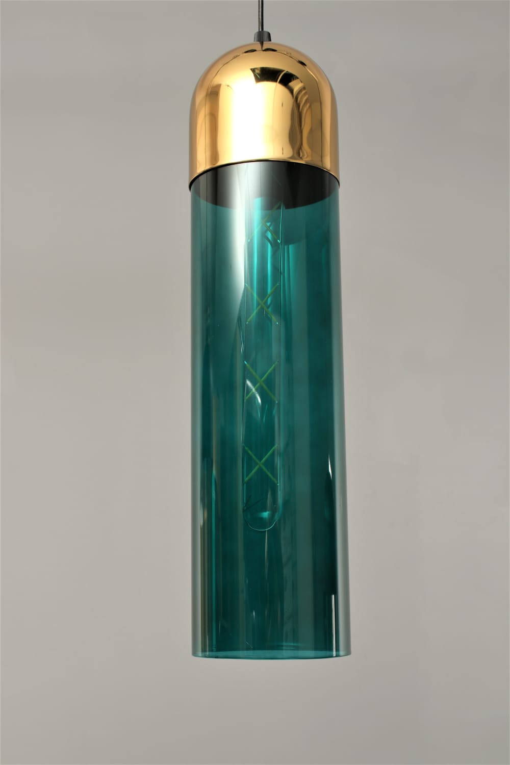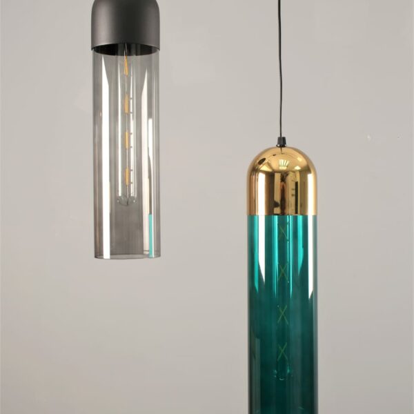גוף תאורה צילינדר תלייה מעוצב בזכוכית לשימוש תאורת פנים. מקור אור E27 8W LED. מיוצר מאלומיניום וזכוכית. זמין בצבע שחור מט, זהב מט. זכוכית טורקיז, זכוכית מעושנת.