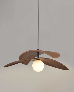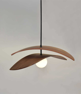 גוף תאורה תלייה מעוצב לשימוש תאורת פנים. מקור אור E27 מיוצר מאלומיניום ועץ. זמין בלבן זהב מט בשילוב עץ אגוז, עץ בהיר.