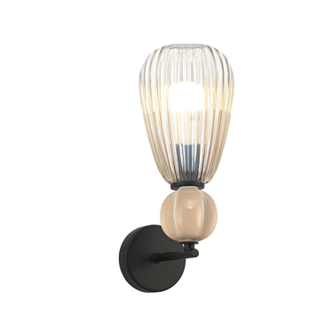 גוף תאורה צמוד קיר מעוצב בקרמיקה לשימוש תאורת פנים. מקור אור E14. מיוצר מקרמיקה זכוכית ואלומיניום. זמין בצבע שחור מט קרמיקה חומה וזכוכית אמבר.